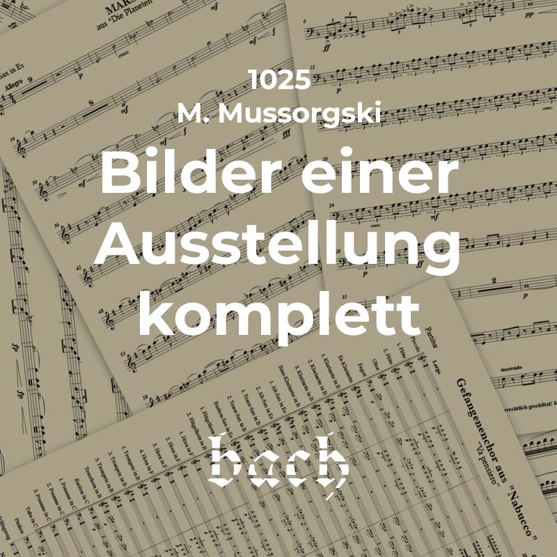 Bilder einer Ausstellung: Das Werk ist ein Musterbeispiel für Programmmusik. Uraufgeführt im Jahre 1874 anlässlich einer Gedenkveranstaltung für den im Jahr zuvor verstorbenen Freund Viktor Hartmann. Das Werk ist für Klavier komponiert, allerdings gibt es eine Vielzahl an Bearbeitungen für die verschiedensten Besetzungen. Diese Bearbeitung sieht als Basis die Klavierstimme, bei einigen Nummern wurde die Dynamik zur Verstärkung der zu erzählenden Szene verändert.